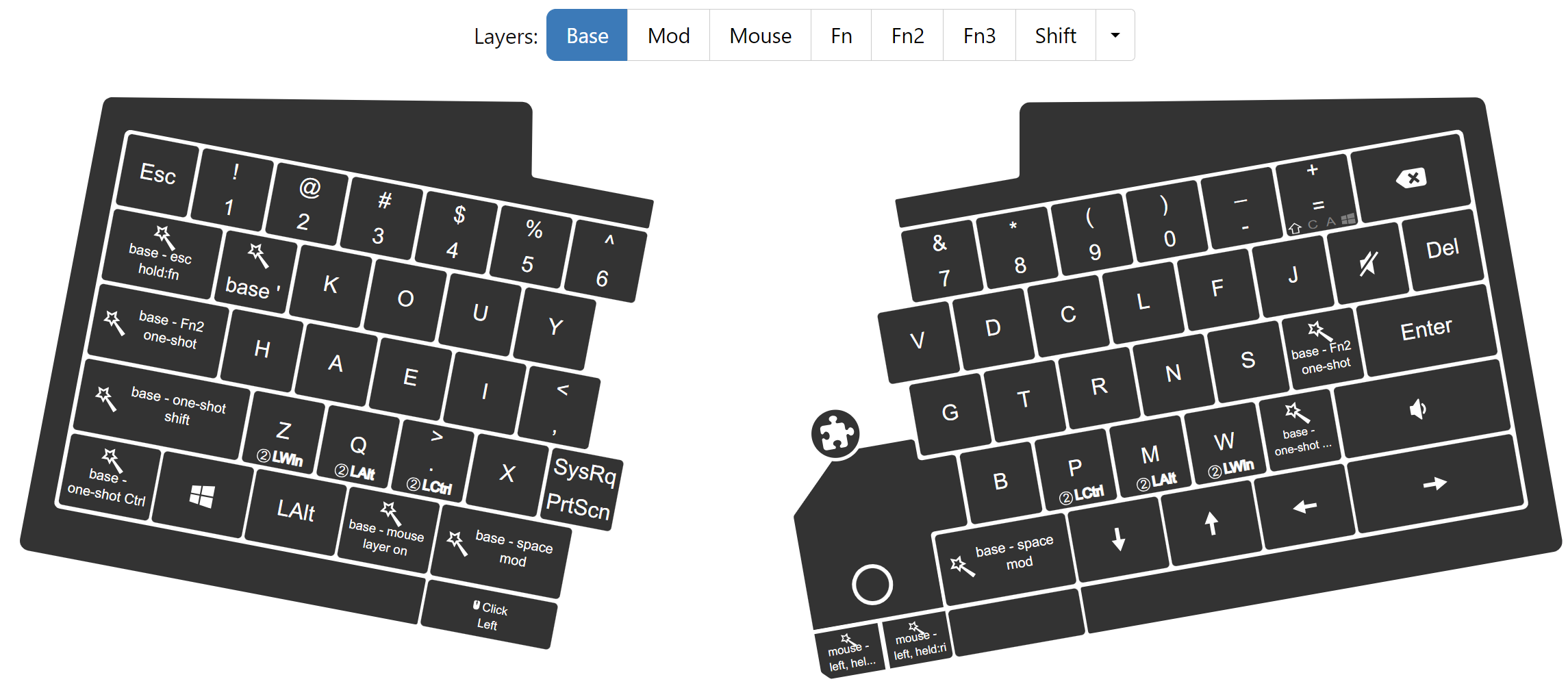 My design is implemented on the UHK, but I took great care that it does translate to column-staggered keyboards as well and that I can use the same configuration on a laptop keyboard, by using software (Kanata) to provide the same fancy functions.