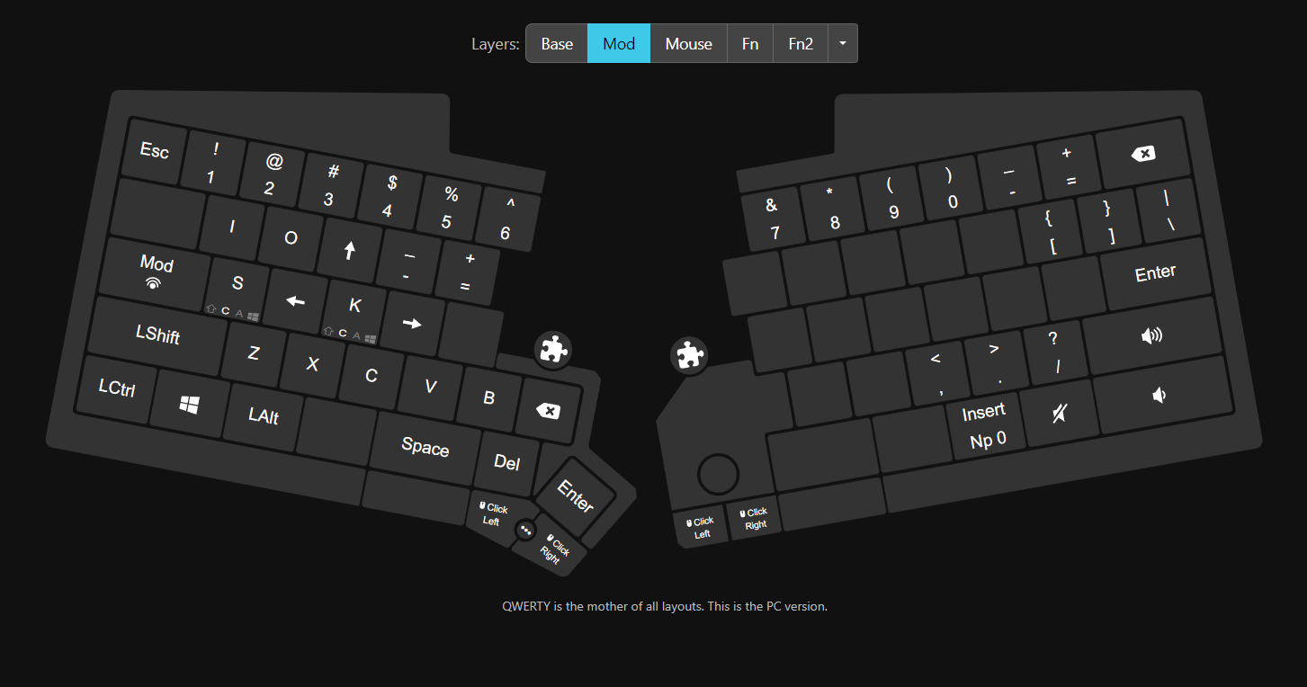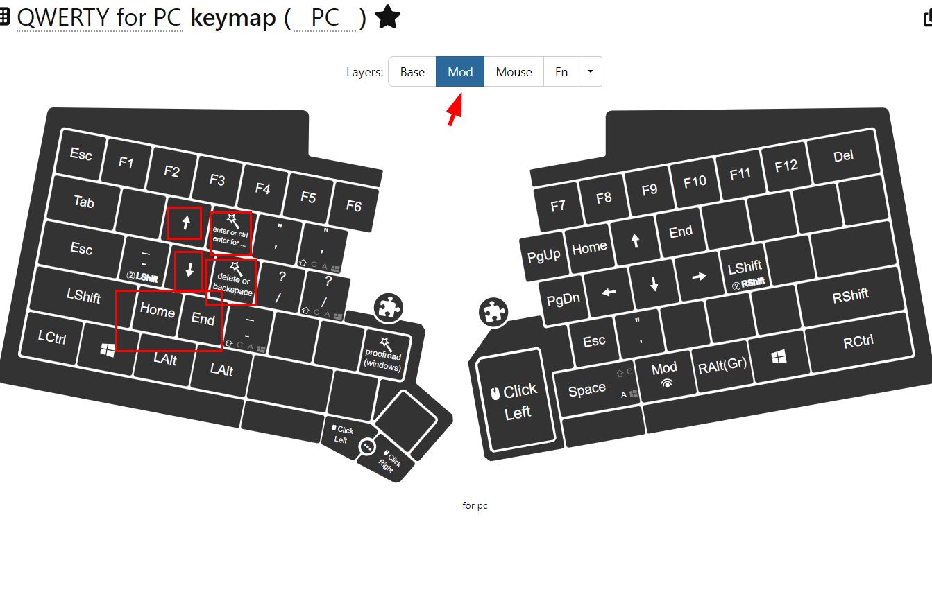I enabled the “double tap to stick” feature for my Mod layer, which I moved to where the Mouse/Caps Lock key is normally, which changes my left hand to do most of what I needed.