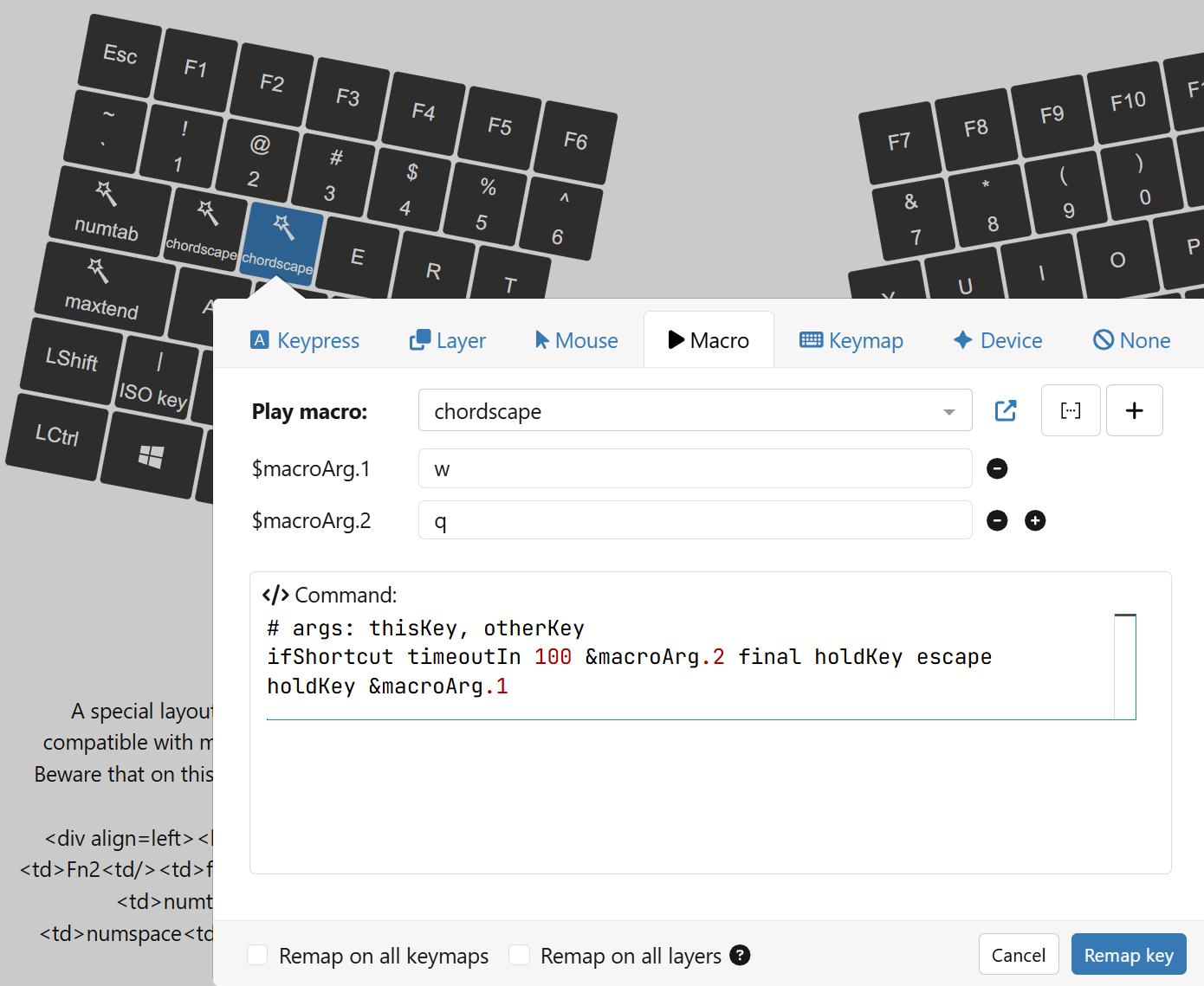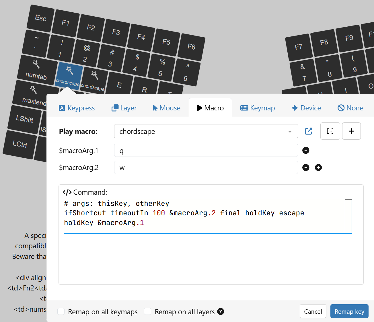 I really think chords should be easier to configure. It is weird that you have to map them to each of the possible starting keys, and that I had to make two separate parts in the macro, one for each starting key. Chords should be specified independent of the order of press, and especially independent of the starting key.