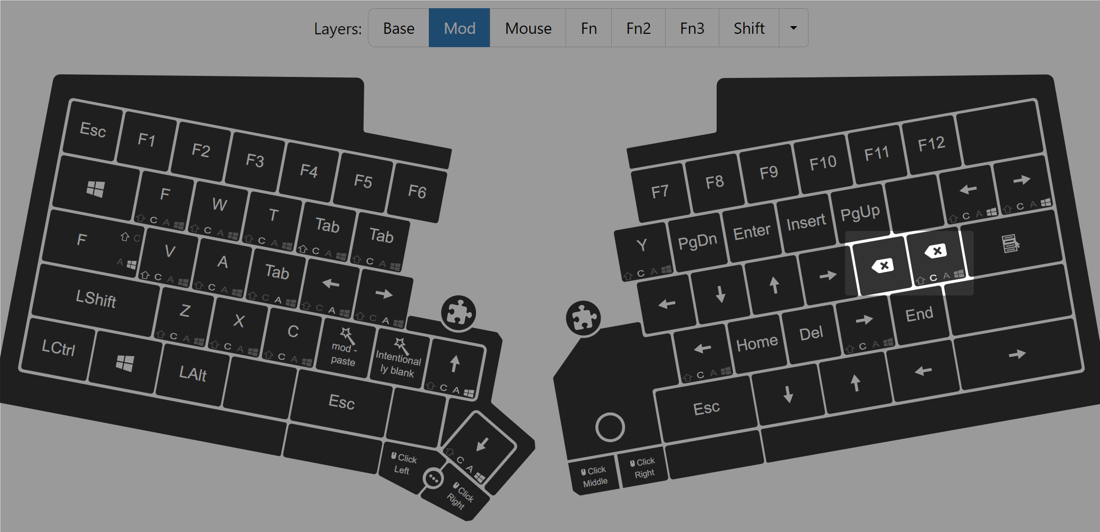 I have it on my mod layer, which is triggered with the left or right space key (while hold, tap is space). I have an extra key to delete whole words as well. That works very nice for me. I also have Enter in that layer (i-key) and do not use the main Enter key while touch typing. Finally ESC is the mod key itself. So holding the right space key and tapping the left will trigger ESC and vice versa as well. ![]()