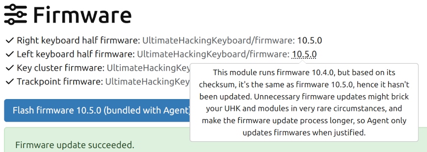 Upgraded firmware to 10.5.0. In agent both the left half & keycluster versions are underlined with warning message to the tune of “this module runs firmware 10.3.0, but based on its checksum, it’s the same as firmware 10.5.0”.