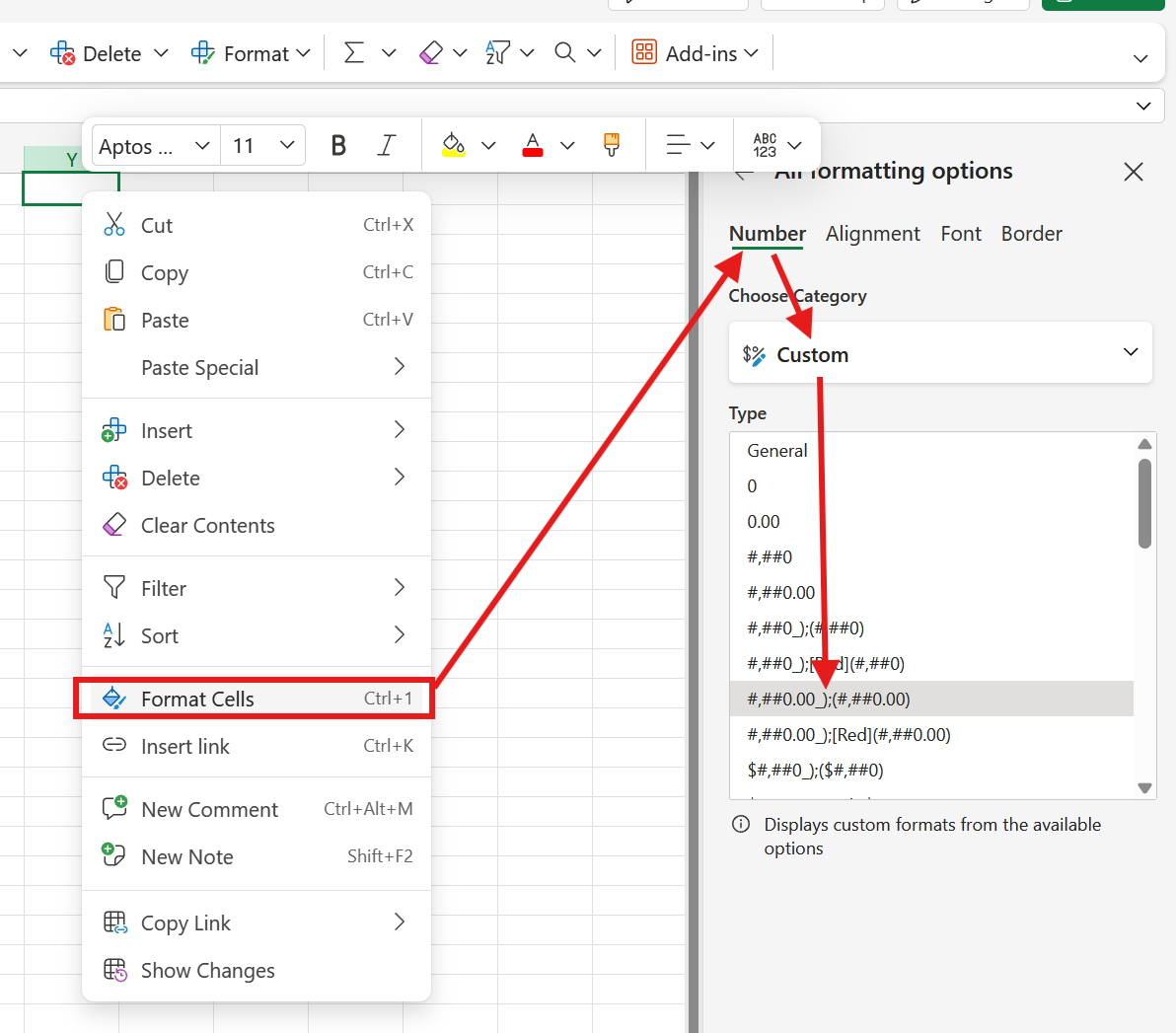 I don’t know my way around Excel, but I think they’re trying to set up a macro to navigate formatting presets. So I think the N is meant to be typed text to bring up the “Number” tab, and CUS text to bring up the “Custom” preset from the drop-down menu.