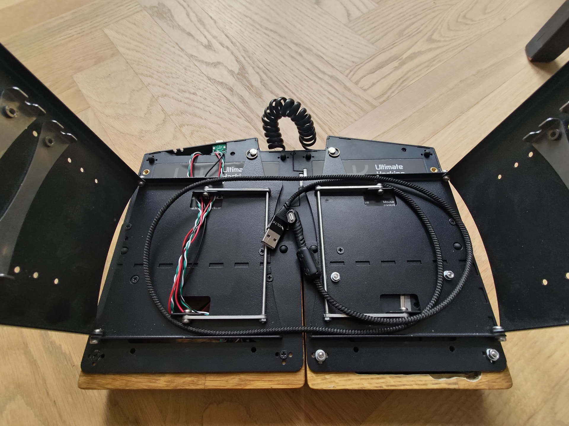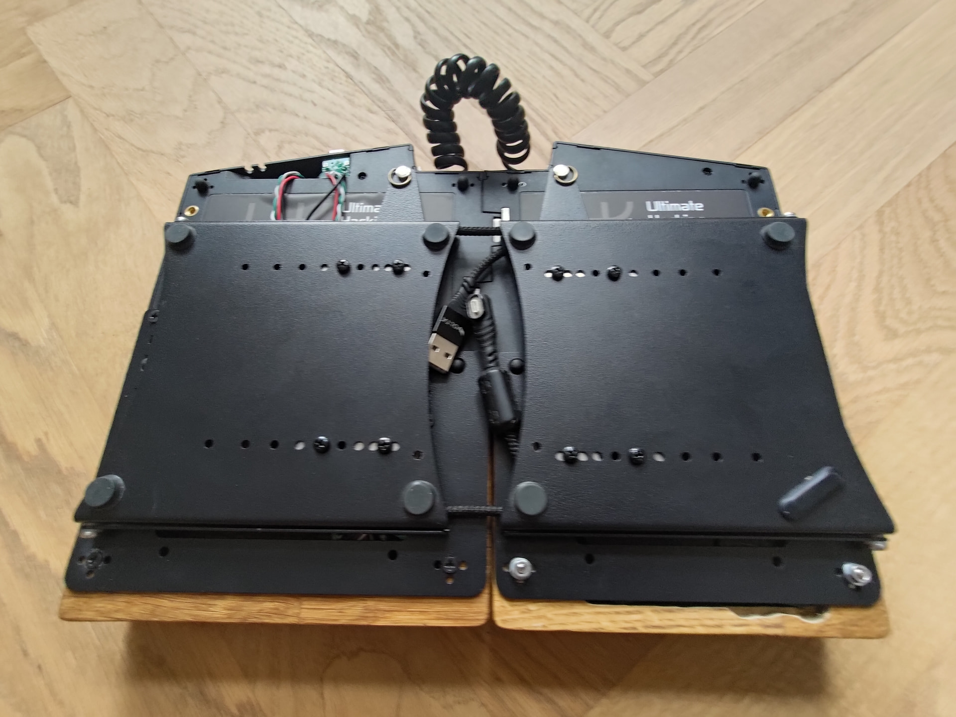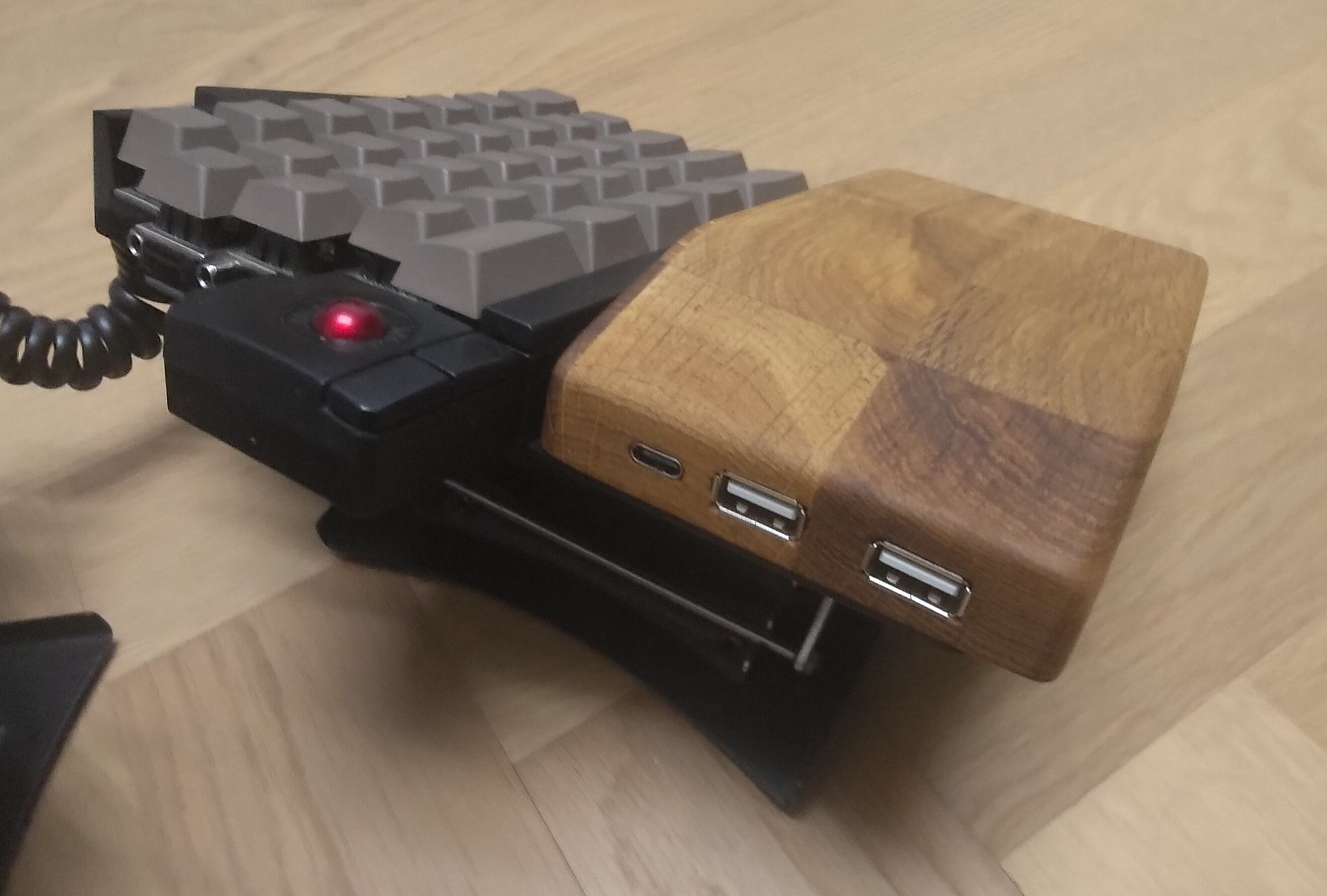 While I was at it, I built an old USB 2 hub I had lying around into the right rest. The wood has been hollowed out to house the hub with plenty of room to spare for future shenanigans, possibly involving a Bluetooth adapter and a battery.