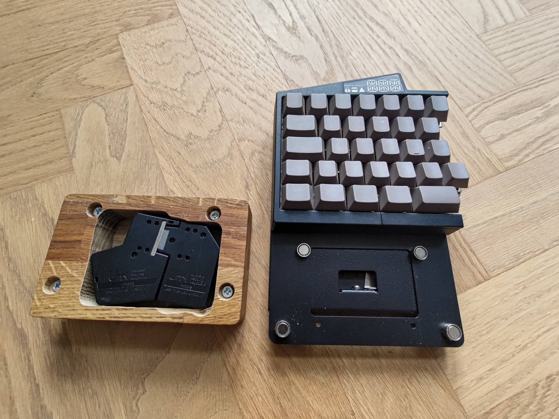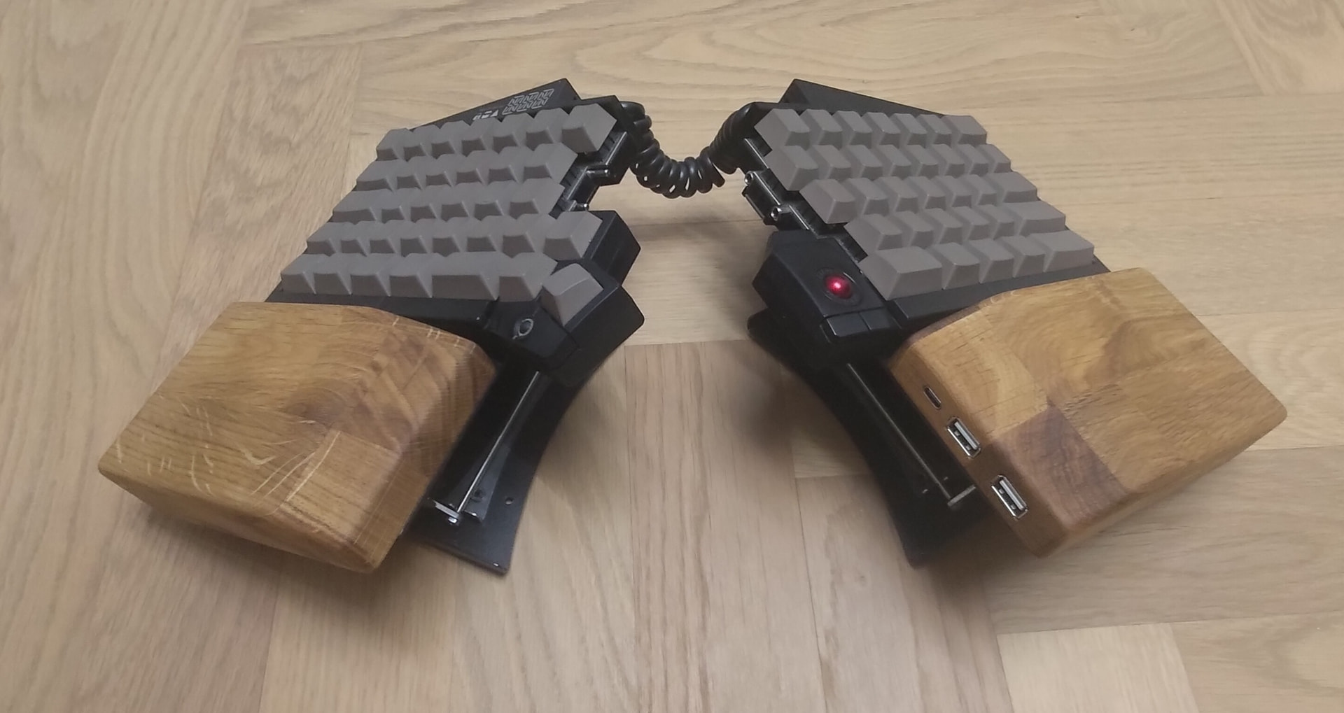 I mentioned it in my configuration showcase post, but not too long ago, I started feeling a little discomfort in my hands after long days of typing. Another thing I noticed, apart from finger contortionism, was that my hand position was uncomfortable on the wrist rest with my wrists doing a small but persistent extension while using the keyboard, probably because I have rather large hands, so I would rest my hands on the wrist rest and have to bend my fingers a lot to get at the keys.