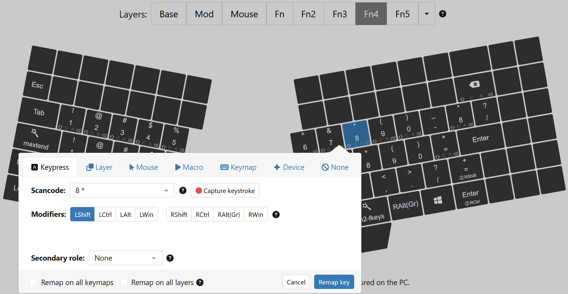 My i key maps to ‘8 *’ with LShift on the fn4 layer – it’s supposed to produce an asterisk (‘*’). When I hit it during quick typing as rightSpace+i it sometimes comes out as ‘*’ and sometimes as ‘8’.