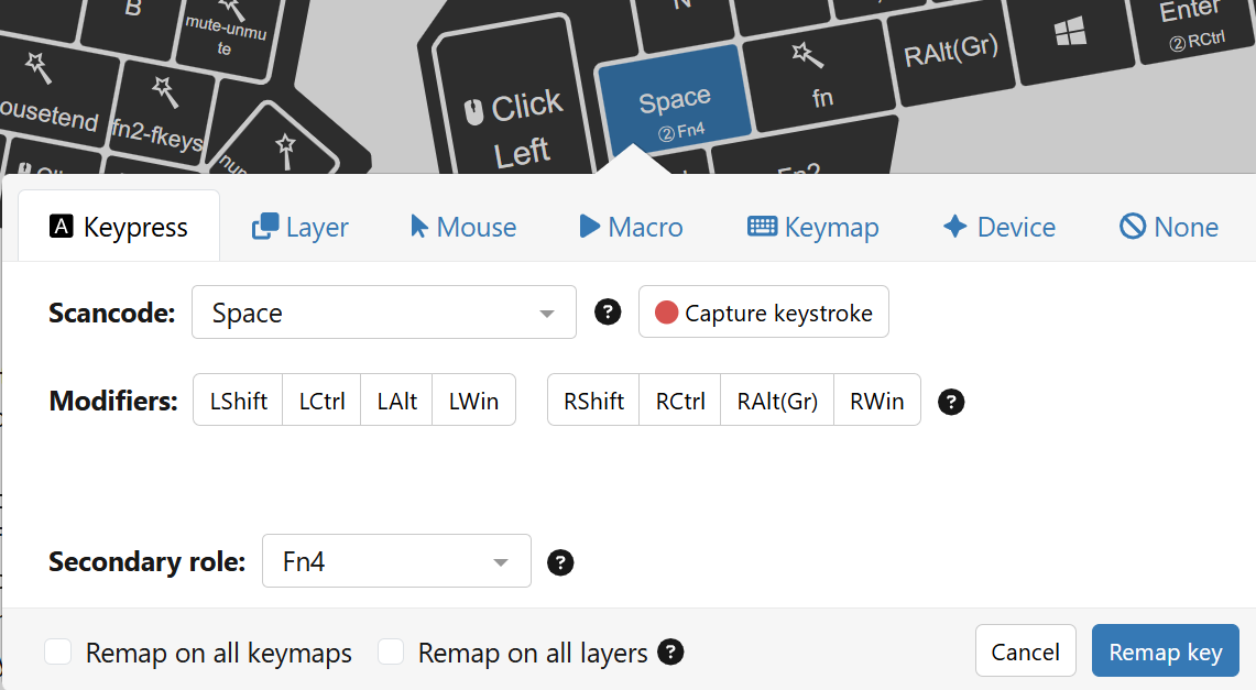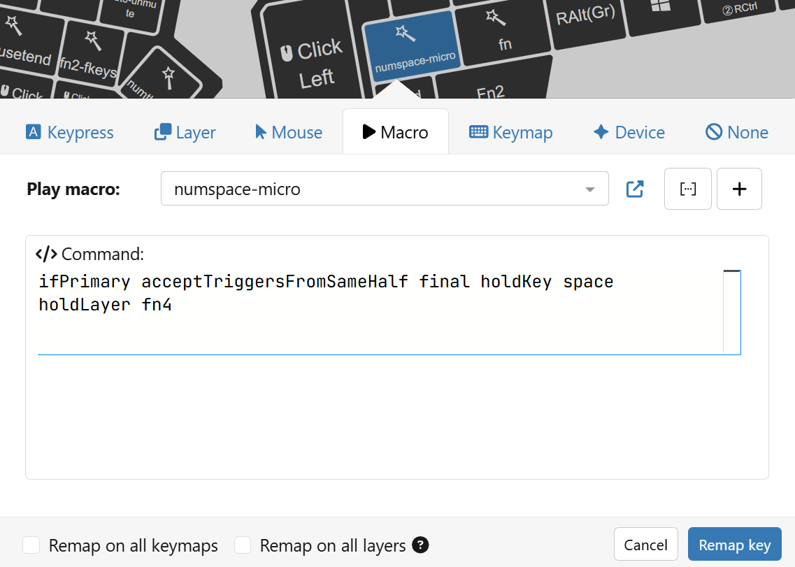 I added acceptTriggersFromSameHalf to the ifSecondary command to make sure that rightSpace+p and rightSpace+‘i’ would trigger correctly when typed quickly. They are after all on the same keyboard half. My init macros set secondaryRole.advanced.acceptTriggersFromSameHalf false.