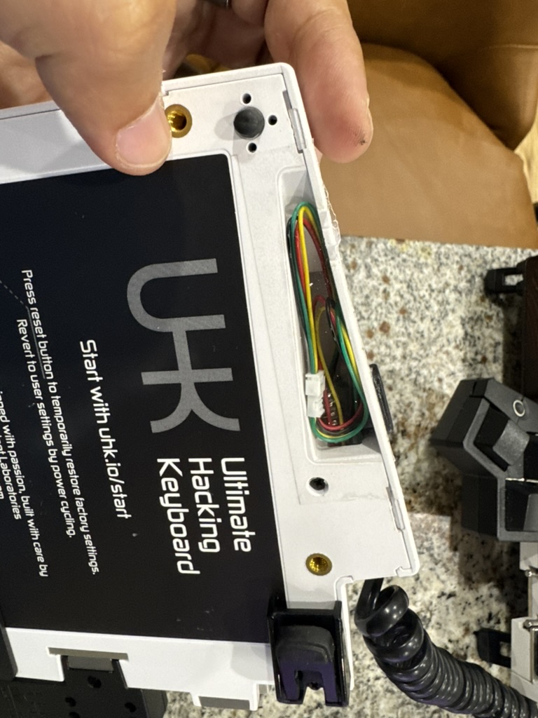 I finally converted my UHK v1 to USB C. The mini usb port had annoyed me for a long time so I opened it and did the mod myself. I used one of those tiny usb c adapters and wired it through a 4 pin connector so I can still take it apart. The wires aren’t short and the inside is kind of scrappy, I even used clear tape in the cable bay.