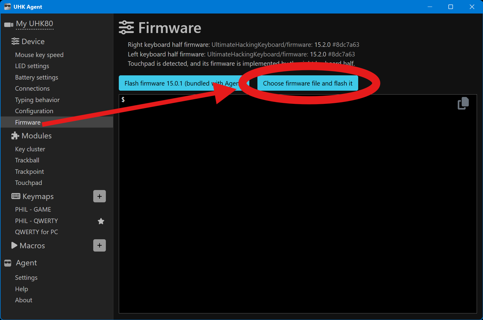 Then open Agent to the “Firmware” tab in the left panel, and in the main panel, click the button that says “Choose firmware file and flash it”.