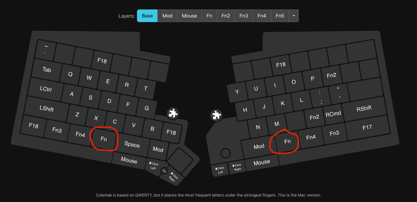 Holding either of them triggers the Fn layer. So far so good. But now I want to enhance this functionality by substituting the Fn keys with macros that on single hold trigger the Fn layer and when concurrently held together a different modifier (in my case Fn5 layer).