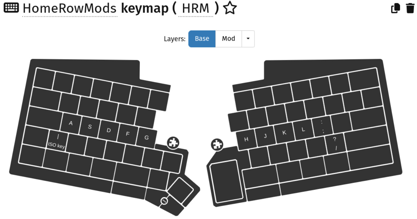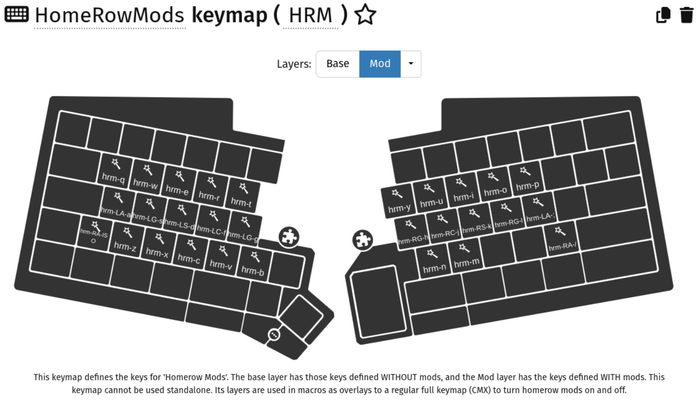To keep it modular, I have moved the home row keys onto a separate keymap (HRM) which is used to overlay my regular keymap.