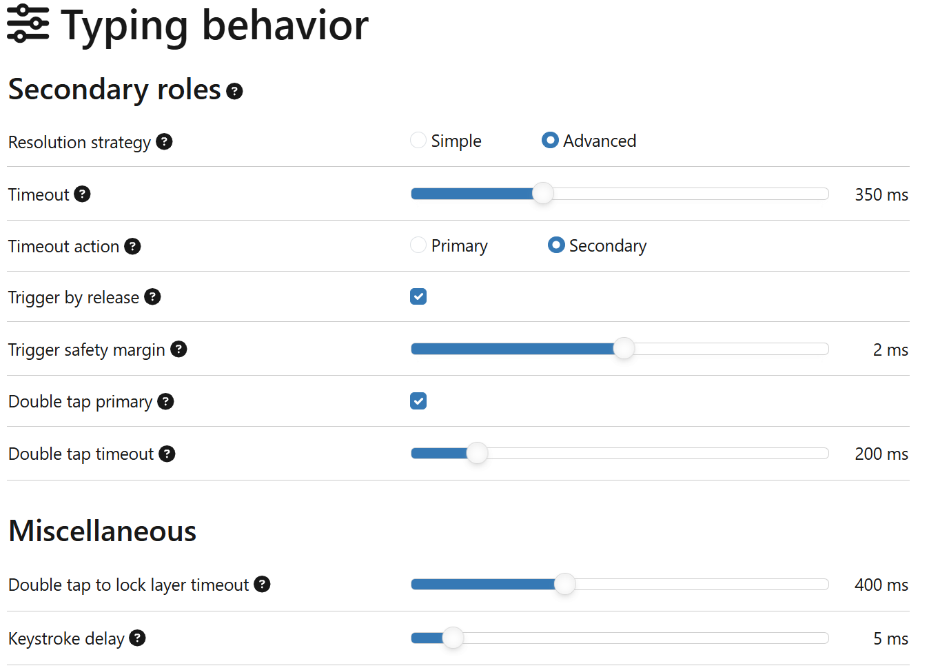 So, when I hold a key with a bound right_shift_tap behavior (e.g. K in Qwerty) and immediately tap any key on the left half, it is immediately interpreted as Shift+Left-Side-Key. But, when I hold the right_shift_tap behavior key, and either tap or hold (interrupt) any key on the same right side, it is immediately interpreted as a tap, no delay. So, I can roll the keys on the same side without being afraid of triggering any combination, and no delay, as if the were no Hold-Tap keys.