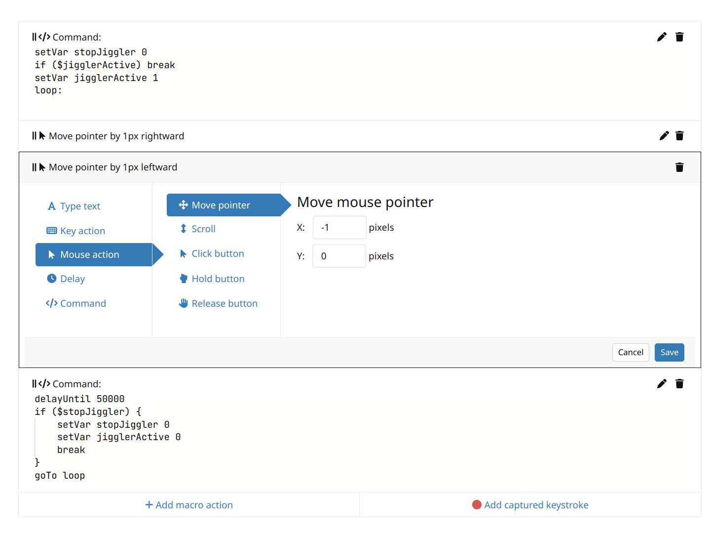 Then a “moveMouse” command with “x”: 0, “y”: 1 (down 1 pixel)