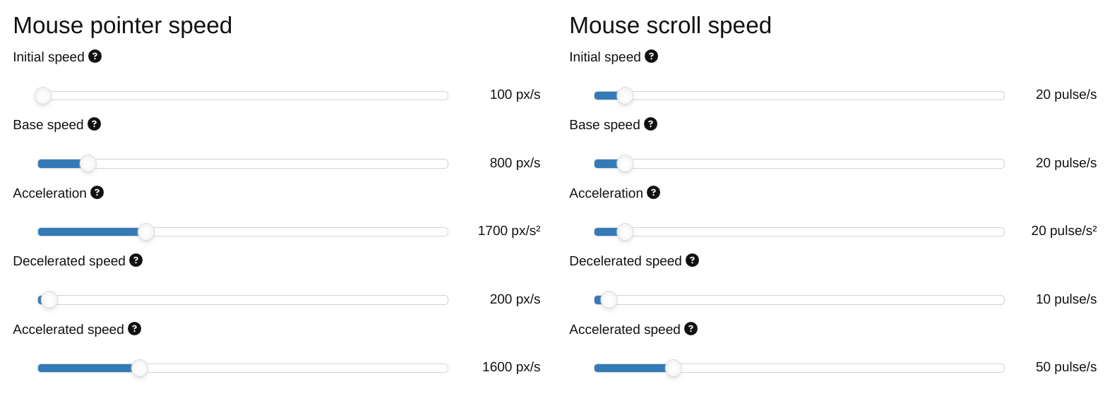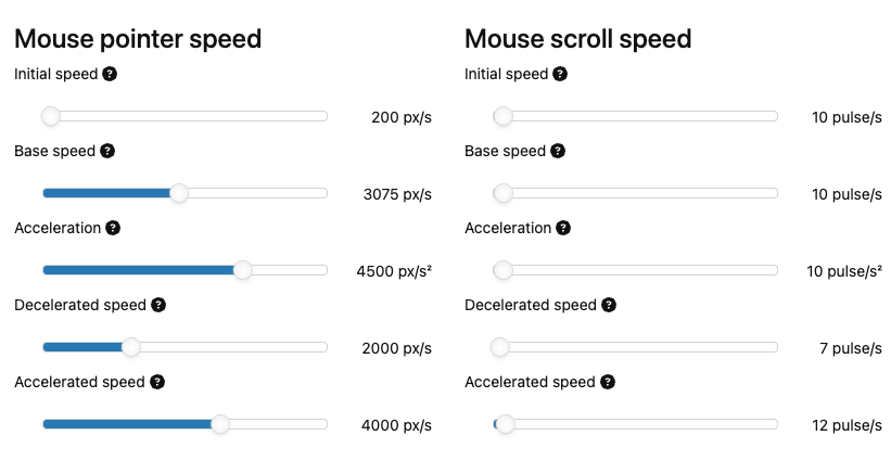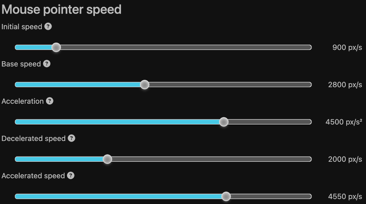 I mention that, because I did do a bunch of “optimisation” in order to ensure that the pointer would move fast enough across a 32" monitor (I usually have two active windows and need to flick between them). I was a little surprised to see that, for the most part, all of my values (with the exception of my Initial speed) are quite close to yours! We’re both a long way from @kareltucek though ![]()
