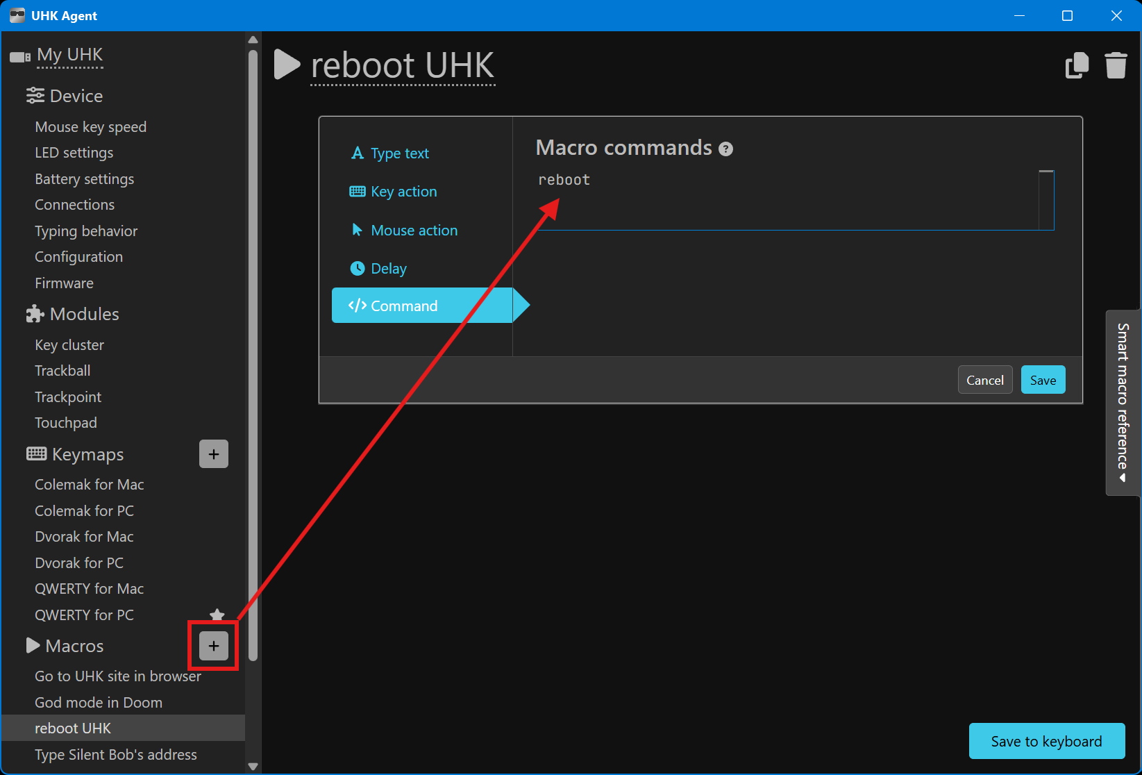 You can create a new macro in Agent’s left panel, and then type reboot into the macro command entry field: