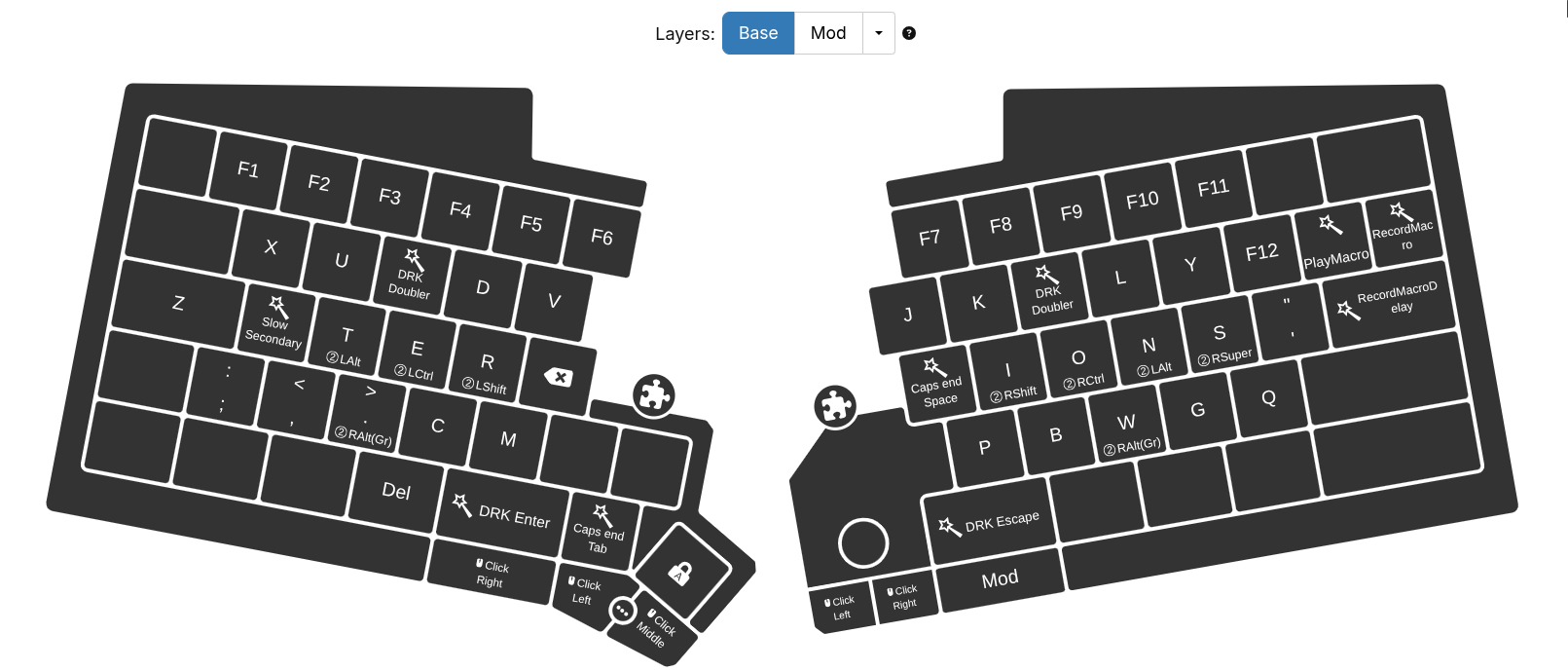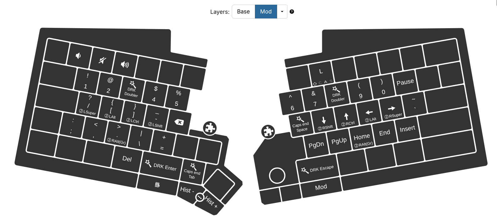 The chassis key mod on the right half is used more or less exclusively for scrolling with the right hand alone when I’m reading long documents. I press it with my thumb and scroll with my index.
