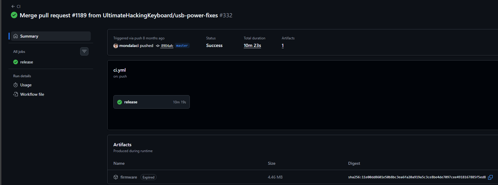 If you mean this artifact: https://github.com/UltimateHackingKeyboard/firmware/actions/runs/14422644330/artifacts/2933383354 then it can be downloaded from Merge pull request #1189 from UltimateHackingKeyboard/usb-power-fixes · UltimateHackingKeyboard/firmware@8904afc · GitHub , and you probably need to be logged into github in order to do so.