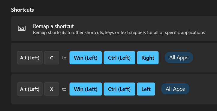 I’m a new user of UHK, just unpacked it and went through the tutorial. I am impressed with the layer functionality! I’m still trying to adapt to the slightly changed positioning of the keys (I’m coming from a Keychron keyboard). Sadly, I’m already having an issue – like the subject says, the default workspace switching mapping doesn’t work on my system. It should send the Left Ctrl + Left Alt + arrow combination. But when I press Mod+F or Mod+S nothing happens. I tried checking with some online keyboard testers and it seems to be OK. The key combination used to work on my old Keychron keyboard. I normally use Windows 11 with English language and a Polish programmers layout (GrAlt is used to enter accented characters), but I switched to US and US International layouts briefly and it did not change anything. I’m on the newest firmware (updated right after setting up the keyboard). Do you have any tips on how to troubleshoot this issue? I use that shortuct A LOT, it’s one of the most often used Windows shortcuts for me. I can’t live without it